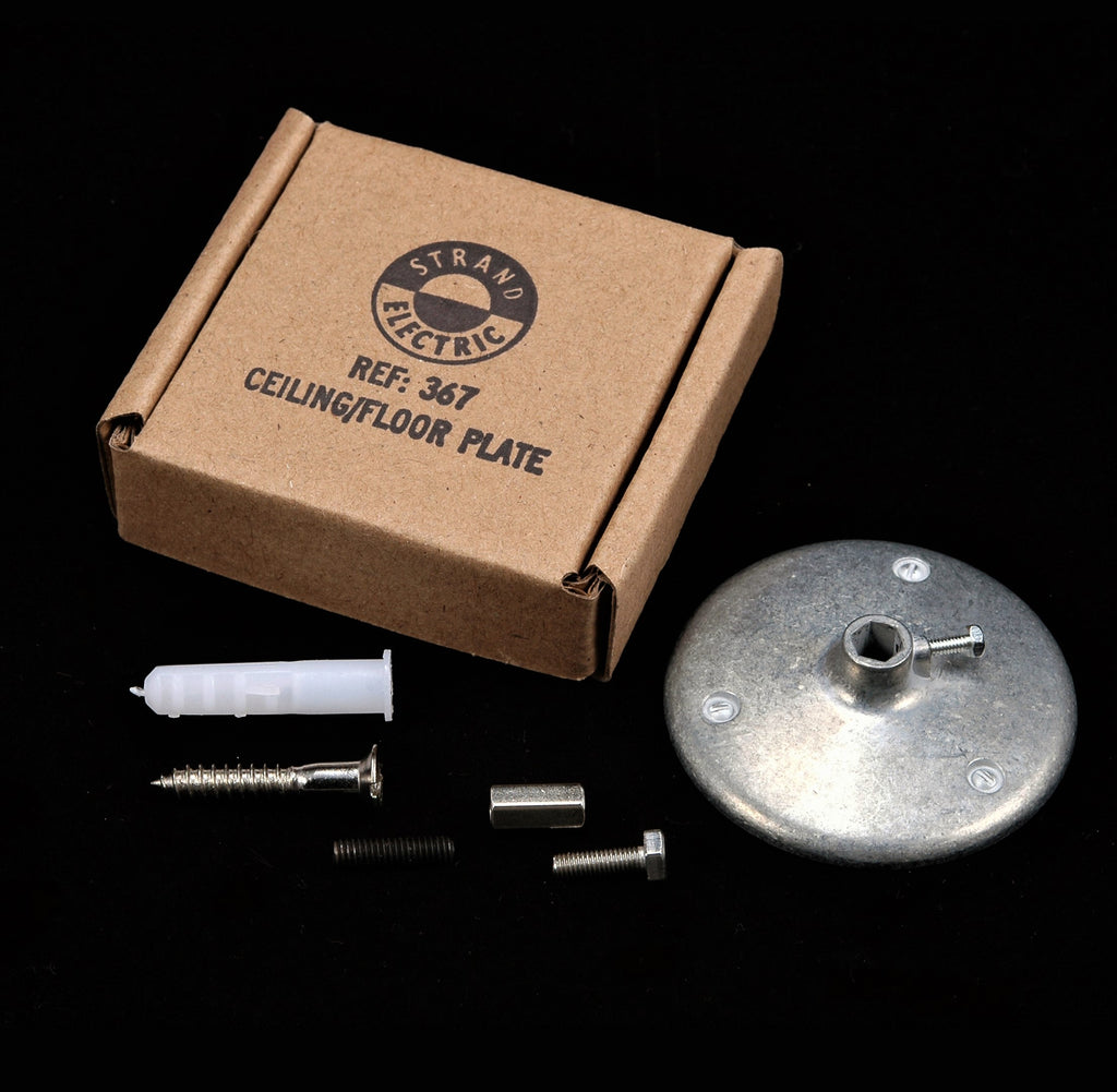 The ceiling/floor plate is cast in zinc and supplied complete with a 1” mirror screw (with 1/8” internal thread), masonry plug, hexagonal adaptor with one end threaded to 1/8” and the other to M3, a 1/8” thread x 1/2" long stud and M3 bolt for attaching to a ceiling. If used as a floor plate, only the hexagonal adaptor and M3 bolt are required.